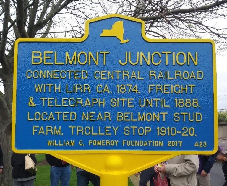 Built in 1874 and located near the Belmont Stud Farm, Belmont Junction station effectively connected the Central Railroad and the Long Island Railroads. It was a freight and telegraph site until it was abandoned in 1888. Later it served as a trolley stop from 1910-1920.