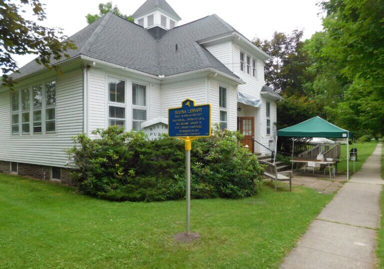 The Bovina Public Library first received their charter in 1917, but the Bovina (NY) History blog run by Bovina Town Historian Raymond LaFever, states that there had been a library in the town “in one form or another since at least 1836.” This first recorded library was known as the Bovina Subscription Library, but it is not clear how long it lasted. The first public library opened a little later in 1879 by the Bovina United Presbyterian Church and was housed in the church basement. The library stayed afloat by receiving both monetary and book donations from prominent men of the time, such as Elbridge Thomas Gerry and Henry Clay Frick. When a state library inspector visited in 1905, he was reported to have said that it was “one of the best selected libraries of its size in the State.”