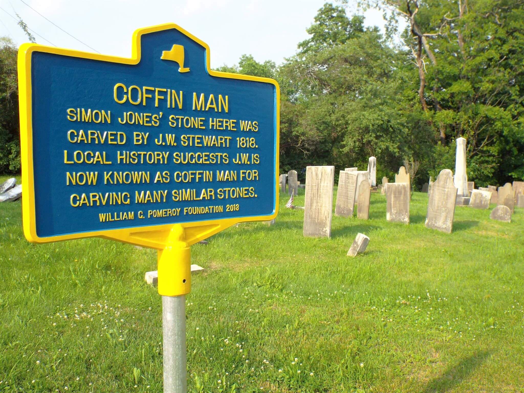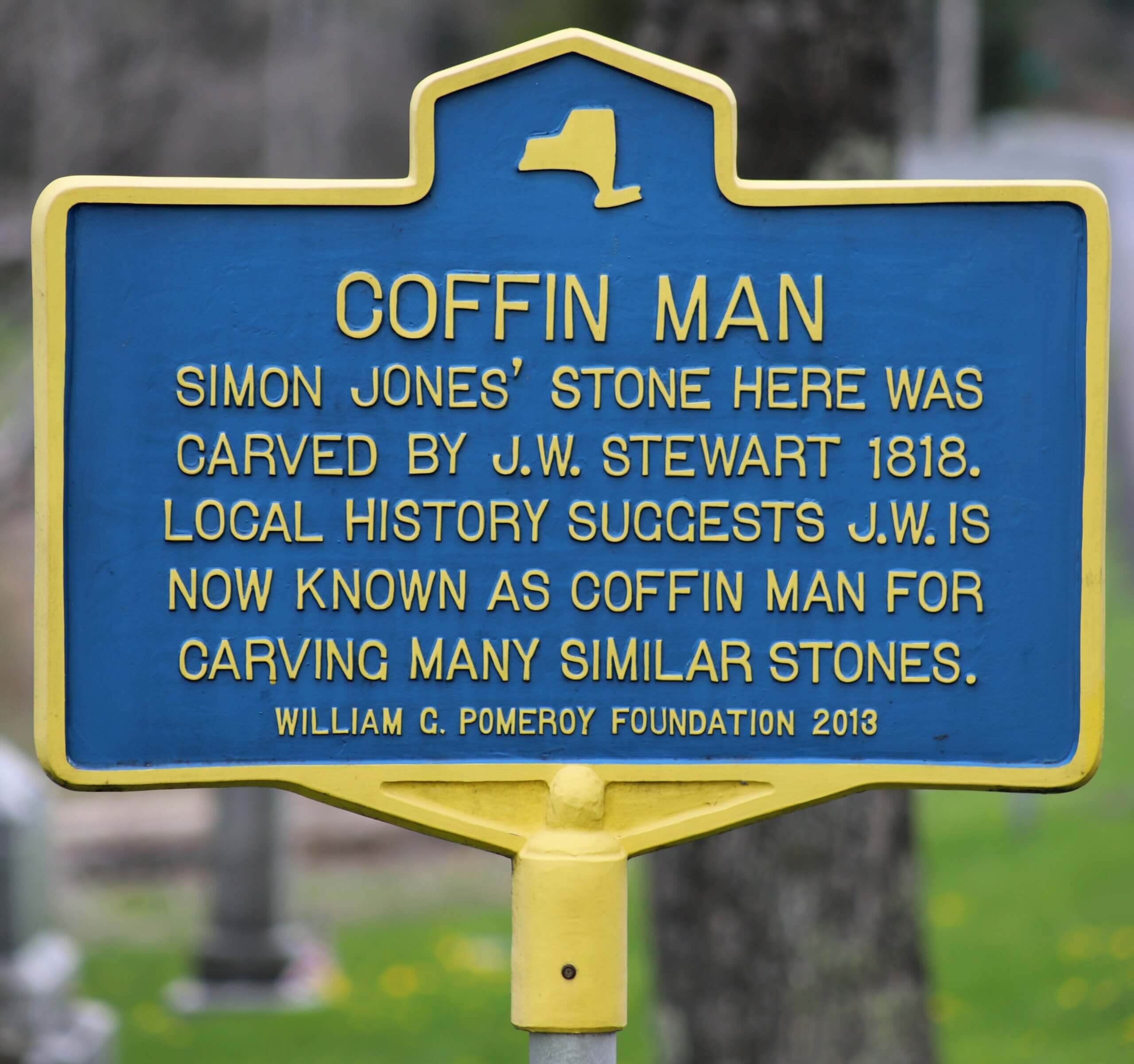 Jonas W. Stewart was born in 1778 into a generational carver family. He and his brother learned the trade from their father, Jonas W. Stewart, Sr. Jonas Jr. carved many stones in eastern Vermont. Around 1810 he traveled westward and spent much of his time in the Town of Coventry due to the nearby quarry which had fine quality stone. He resided in a local hotel on a busy turnpike road and carved stones across south central New York State. In order to make his work known, he would often carve a simple coffin with an overarching willow on the stone’s face. He was also known to utilize a more creative approach with “fanciful folk images” related to the deceased. He occasionally carved winged faces mimicking his father’s New England archaic Puritan design. On July 31, 1822, J. W. Stewart was arrested for an unknown reason by a constable in Coventry. At that time, his work ceased.