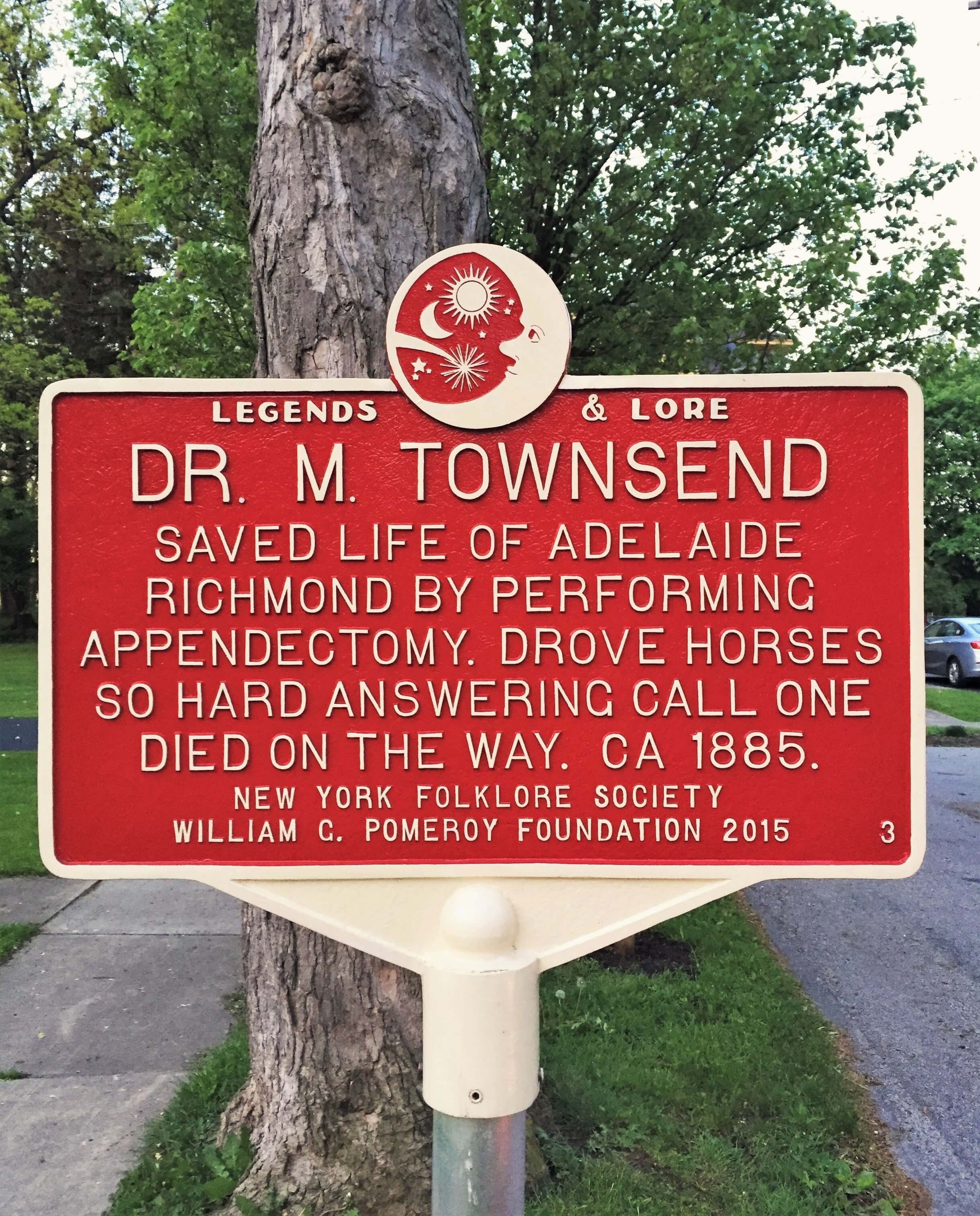 This story goes, that around 1885, Dr. M. Townsend, a Civil War surgeon, saved the life of young Adelaide Richmond by performing an appendectomy. On the way, he drove the horses so hard that one of them died. It’s said that Adelaide would not have survived if not for the quick response and medical prowess of Dr. Townsend.