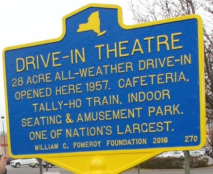 At this site in Copiague, New York, was once the All-Weather Drive-In Theatre. Built 1957 at an estimated cost of one million dollars, this drive-in was on the cutting edge of family entertainment and at 28 acres was one of the largest drive-ins in the U.S. The theatre layout combined an outdoor viewing area with room for 1,370 cars with an indoor theatre of 1,500 capacity. The drive-in possessed a variety of features such as an amusement park, tally–ho train, and cafeteria. It closed in 1984.