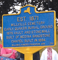 Millville Cemetery, established in 1871, began as a Quaker burial ground. The vault and stone wall were constructed in 1875, from locally sourced Medina sandstone. The chapel was built later on in 1894.