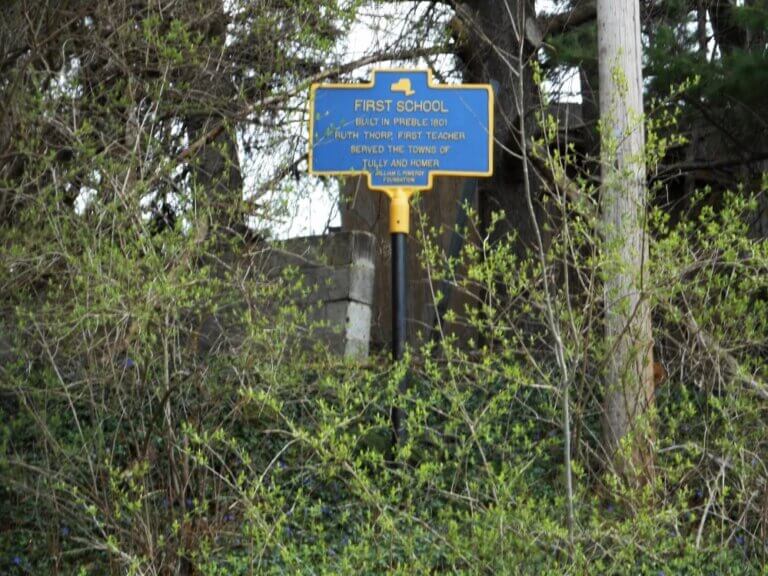 The site of the first school of Preble is located just east of town, near the intersection of East Hill Road and County Route 108. The school formed in 1801. Children came from all parts of the town and as far south as Homer and north to Tully. When other districts formed, this location was abandoned.