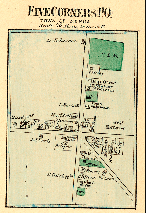 According to J.H. French’s 1860, Gazetteer of New York State, Genoa was originally formed under the name Milton in 1789. The town name was later changed to Genoa in 1808. Five Corners is a hamlet within the Town of Genoa established circa 1820s. It is named for its five-way intersection of local roads. It is also the intersection of four old military tracts. A hand drawn map of Milton (modern-day Genoa) created by Jacob Hart in 1790 illustrates the land subdivided into 500 lots utilized as “military gratuity lands.” The four tracts that met at Five Corners were lots 24, 25, 33, and 34.
