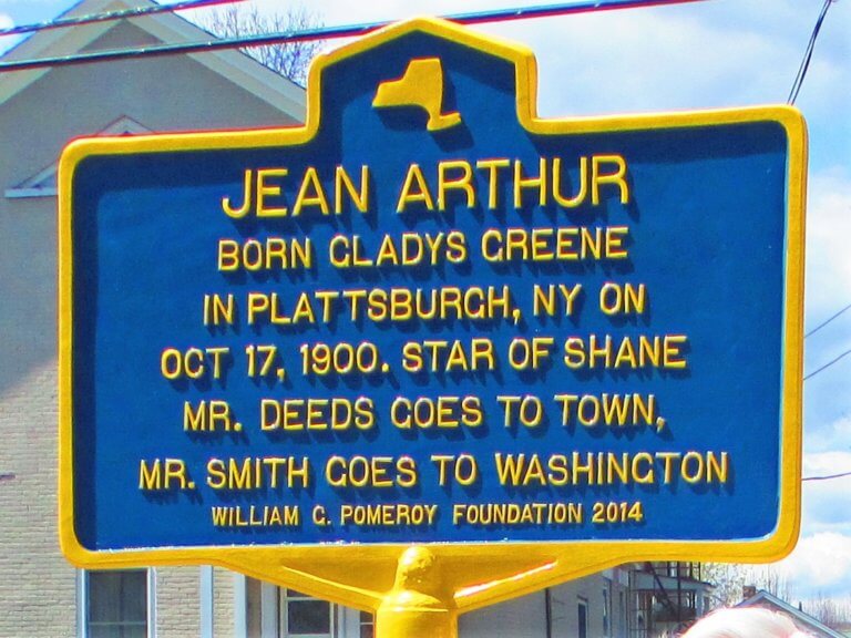 Jean Arthur, born Gladys Georgiana Greene, on October 17, 1900 in Plattsburgh, was a screen actor of the 1930s and 1940s. She became a star in 1936 playing reporter Babe Bennett in Frank Capra’s Mr. Deeds Goes to Town. For the next eight years, she was a sought after leading lady and was called “Queen of the Hollywood Screwball Comedy.” Her films include: You Can’t Take It With You, Mr. Smith Goes to Washington, The Plainsmen, The More the Merrier, and Shane. In 1950 she enjoyed success on Broadway in a production of Peter Pan.
