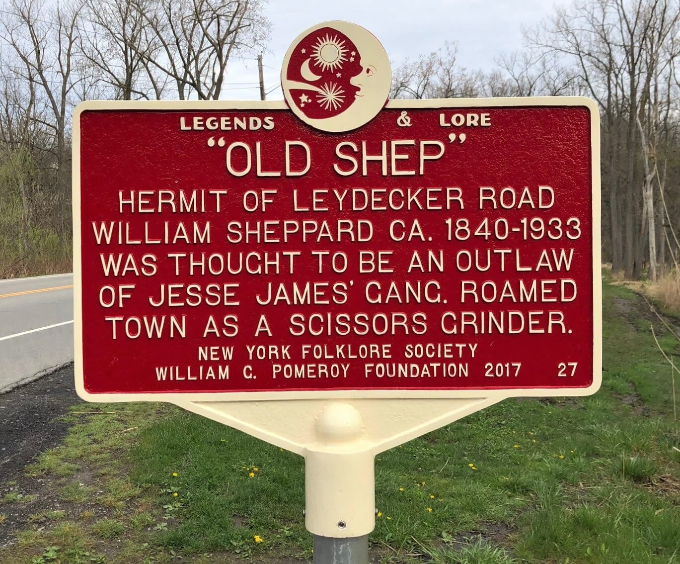 Local lore goes that “Old Shep” fought in the Civil War and was rumored to have been an outlaw with the Jesse James Gang. Shep headed east after taking a bullet during a bank robbery, settling in a shack on the banks of Cazenovia Creek in West Seneca, NY around 1910. He lived as a hermit, but also traveled around as a peddler, ringing a bell to announce his availability to sharpen knives and scissors on a grindstone that he pulled on a cart. He also tended gardens. Despite being a recluse, Old Shep shared his tales. He died in 1933.