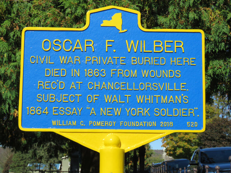 Oscar F. Wilber served in the 154th NY Infantry during the Civil War. Injured at Chancellorsville, he met Walt Whitman at Armory Square Hospital where he was being treated for his wounds, from which he succumbed in 1863. His story inspired Whitman to write his well-known essay, “A New York Soldier.” Wilber’s thighbone is preserved at the National Museum of Health & Medicine in Maryland.