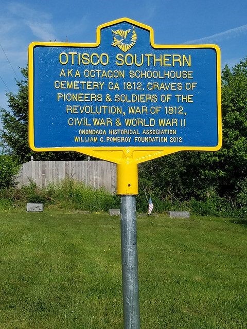 Otisco Southern Cemetery, aka the Octagon Schoolhouse Cemetery, is located on the southwest corner of Route 80 and Octagon Road. Named for the Octagon Schoolhouse which once stood on a neighboring lot, this burial ground is the final resting place of several Revolutionary War veterans, as well as veterans from the War of 1812, Civil War, and World War II.