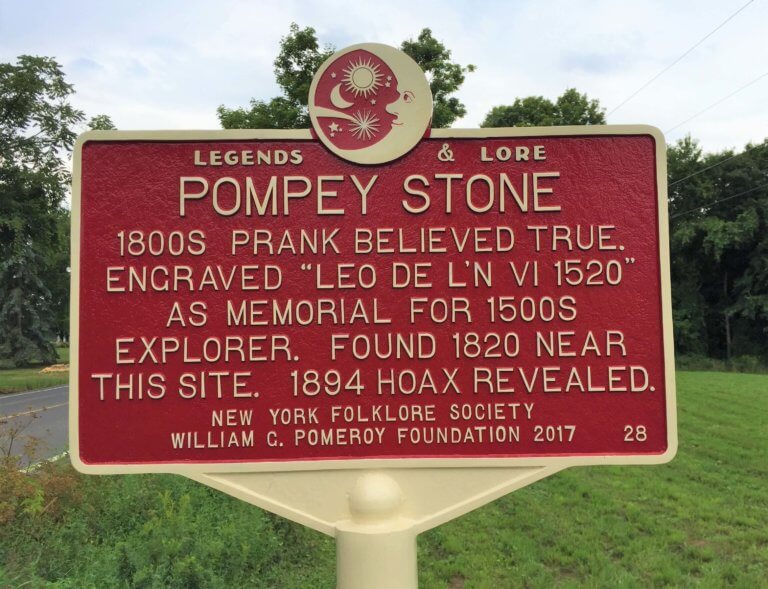 The story behind the Pompey Stone spans nearly two centuries. In 1820, a local farmer Philo Cleveland reported finding the stone when clearing his fields. The stone, which is engraved “Leo De L’N VI 1520,” was believed for many years to be an authentic artifact from a Spanish explorer. In 1894, there were claims that two local men had doctored it in a blacksmith shop in nearby Oran, NY. The relic’s authenticity immediately fell into question and there’s been various stories about the hoax ever since.