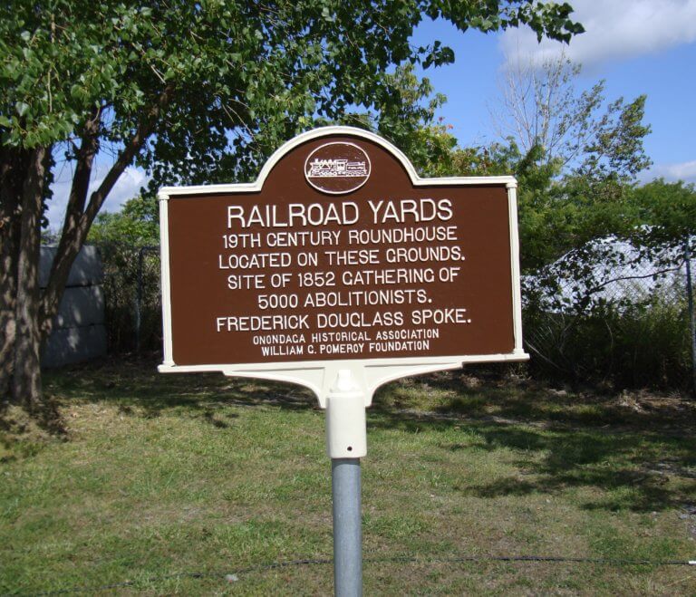 On October 1, 1851, the famous Jerry Rescue occurred in Syracuse. A fugitive slave, William “Jerry” Henry, had been arrested by federal authorities under terms of the Fugitive Slave Law. Syracuse abolitionists organized a jailbreak. Henry was freed and spirited away to freedom in Canada. U.S. authorities proceeded to prosecute several local men in response to this willful violation of federal law. Abolitionists, wishing to continue a protest of the Fugitive Law and to support those indicted, decided to stage a Jerry Rescue Celebration on its first anniversary, October 1, 1852. Several local city officials were greatly upset with this planned celebration and the plan to hold the celebration at City Hall was voted down. Syracuse & Utica Railroad president John Wilkinson then stepped forward and offered the use of his new roundhouse. The day-long event was staged there with approximately 5,000 in attendance. Speakers included famous anti-slavery leaders of the day such as William Lloyd Garrison, Lucretia Mott and Frederick Douglass.
