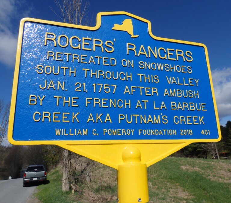 Fire from both sides ceased at night fall, and concluding that night was their best chance at escape, Rogers ordered his men to continue the retreat to Lake George. The force made it back to Fort William Henry on January 23, 1757, and as of 2019, this marker stands with another in Ticonderoga to commemorate the ambush and retreat of Rogers’ Rangers.
