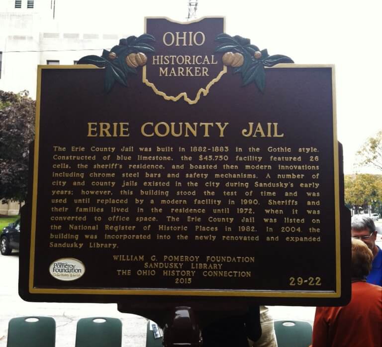 The Erie County Jail was built in 1882-1883 in the Gothic style. Constructed of blue limestone, the $45,750 facility featured 26 cells, the sheriff’s residence, and boasted then modern innovations including chrome steel bars and safety mechanisms. A number of city and county jails existed in the city during Sandusky’s early years; however, this building stood the test of time and was used until replaced by a modern facility in 1990. Sheriffs and their families lived in the residence until 1972, when it was converted to office space. The Erie County Jail was listed on the National Register of Historic Places in 1982. In 2004 the building was incorporated into the newly renovated and expanded Sandusky Library.
