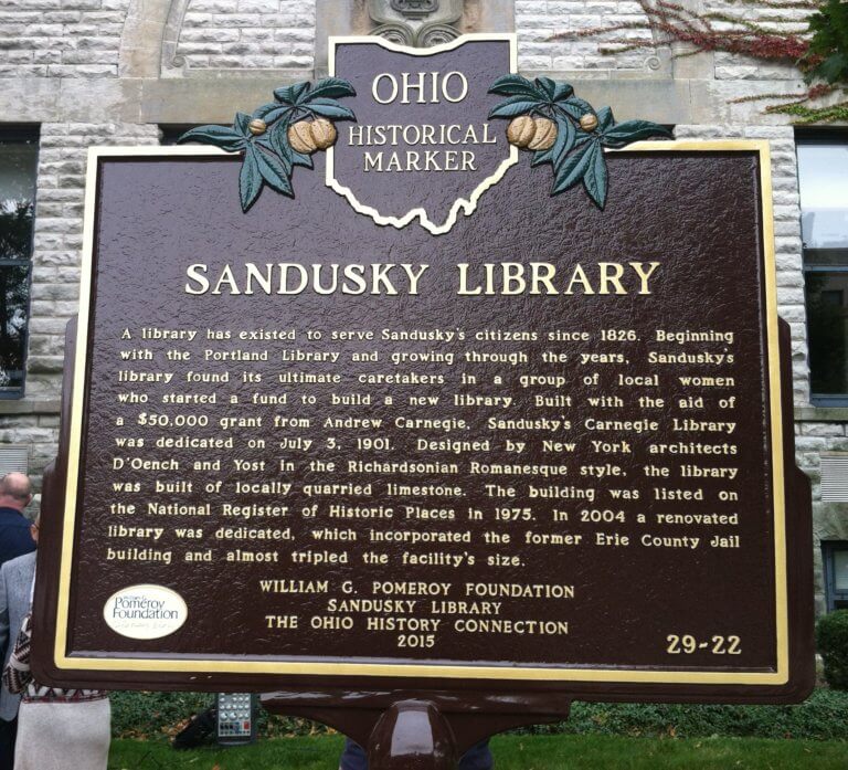 A library has existed to serve Sandusky’s citizens since 1826. Beginning with the Portland Library and growing through the years, Sandusky’s library found its ultimate caretakers in a group of local women who started a fund to build a new library. Built with the aid of a $50,000 grant from Andrew Carnegie, Sandusky’s Carnegie Library was dedicated on July 3, 1901. Designed by New York architects D’Oench and Yost in the Richardsonian Romanesque style, the library was built of locally quarried limestone. The building was listed on the National Register of Historic Places in 1975. In 2004 a renovated library was dedicated, which incorporated the former Erie County Jail building and almost tripled the facility’s size.