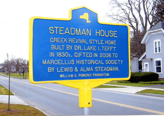 The Steadman house, also known as the Tefft-Steadman House, is an example of a Greek Revival style. It is also significant because it was made of brick, which was uncommon for rural New York. Some suggest that the brick was imported from England and used as a ballast on the ship, sailed up the St. Lawrence River and then down the Black River as far as possible before being hauled overland to Marcellus. Others say the brick could have been made in Marcellus. The front door has a full stone surround with flanking stone pilasters and a projecting stone cornice. Many of the six-over-six double hung windows have original sash and narrow stone sills and flat stone lintels. The home features 6 fireplaces (3 with marble liners and one on the lower level with the original crane), a carved circular staircase with cherry baluster, railing and elaborate Greek Revival style moldings which are featured on the exterior and then replicated around the door frames, windows and fireplaces. The house was listed on the National Register of Historic Places in 2007.