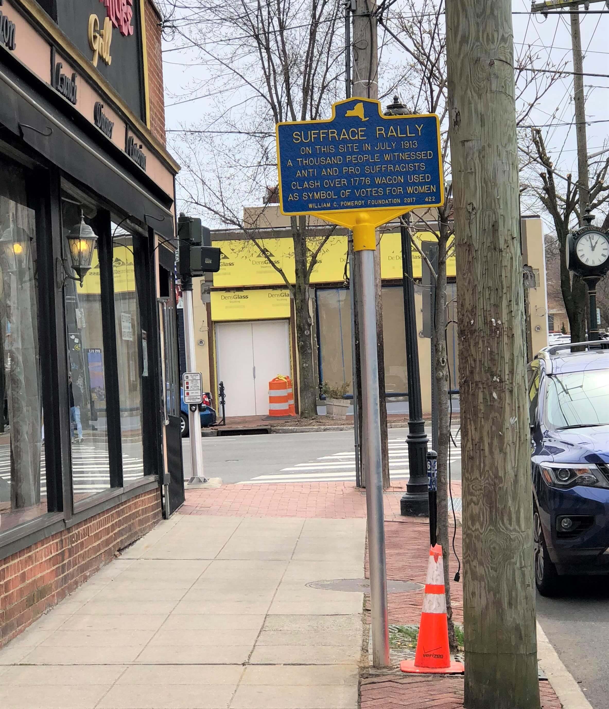 It was on this site in July of 1913 that over one thousand people witnessed both anti and pro suffragists clash over the 1776 Wagon that was used as the symbol of the Votes for Women Movement. The “Spirit of 1776” wagon, which dates to the American Revolution, was donated to the New York Woman Suffrage Association by the I.S. Remson Wagon Company of Long Island, New York.