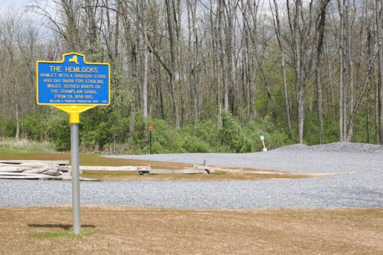 The Hemlocks was a hamlet along the Champlain Canal in a section known as the “long level”, a 16-mile section between the Stillwater and Schuylerville locks. It was found between the villages of Schuylerville to its north, and nearby Coveville to its south. (Map, Town of Saratoga, 1866) The Hemlocks had a grocery store and a barn for stabling mules.