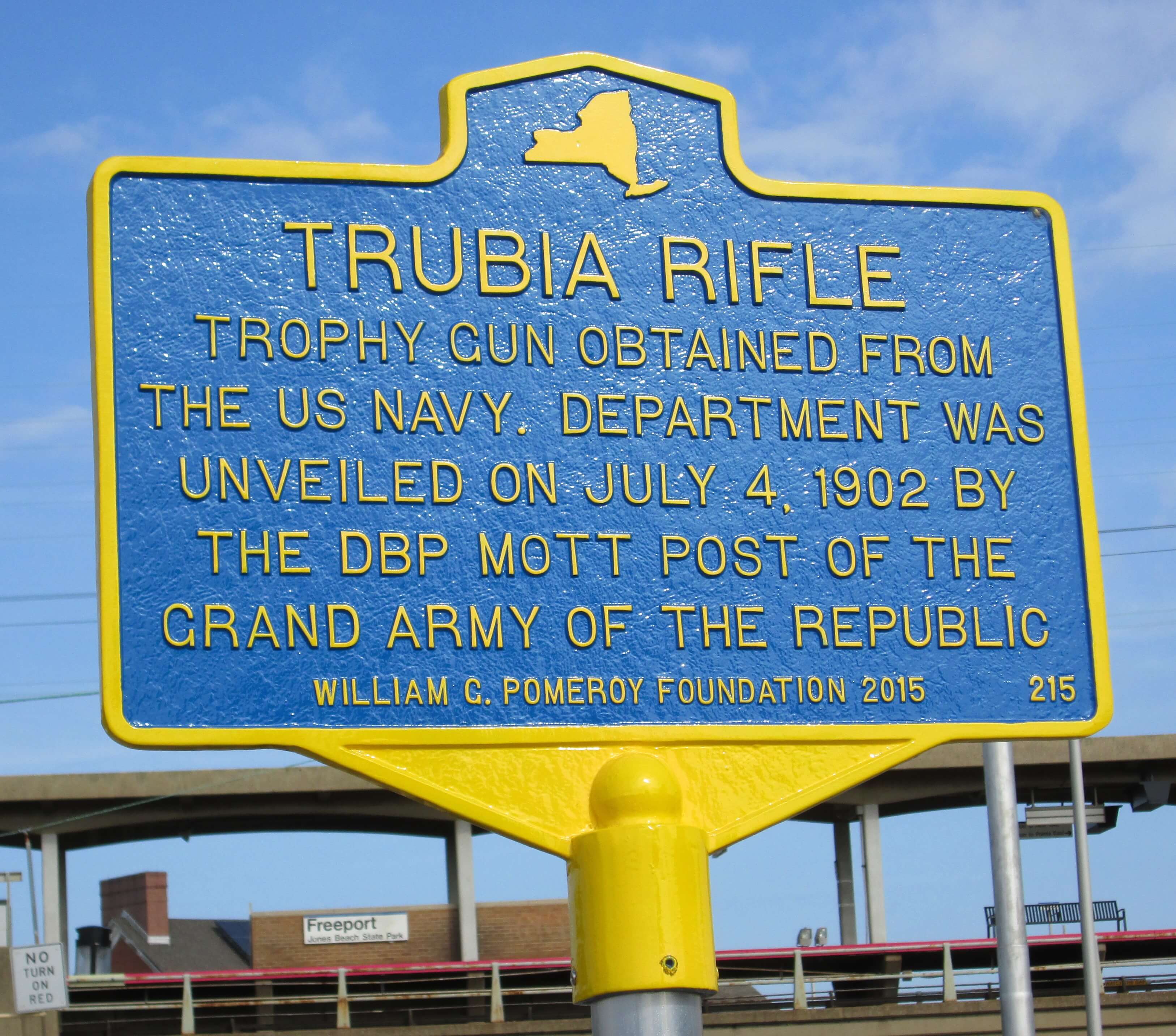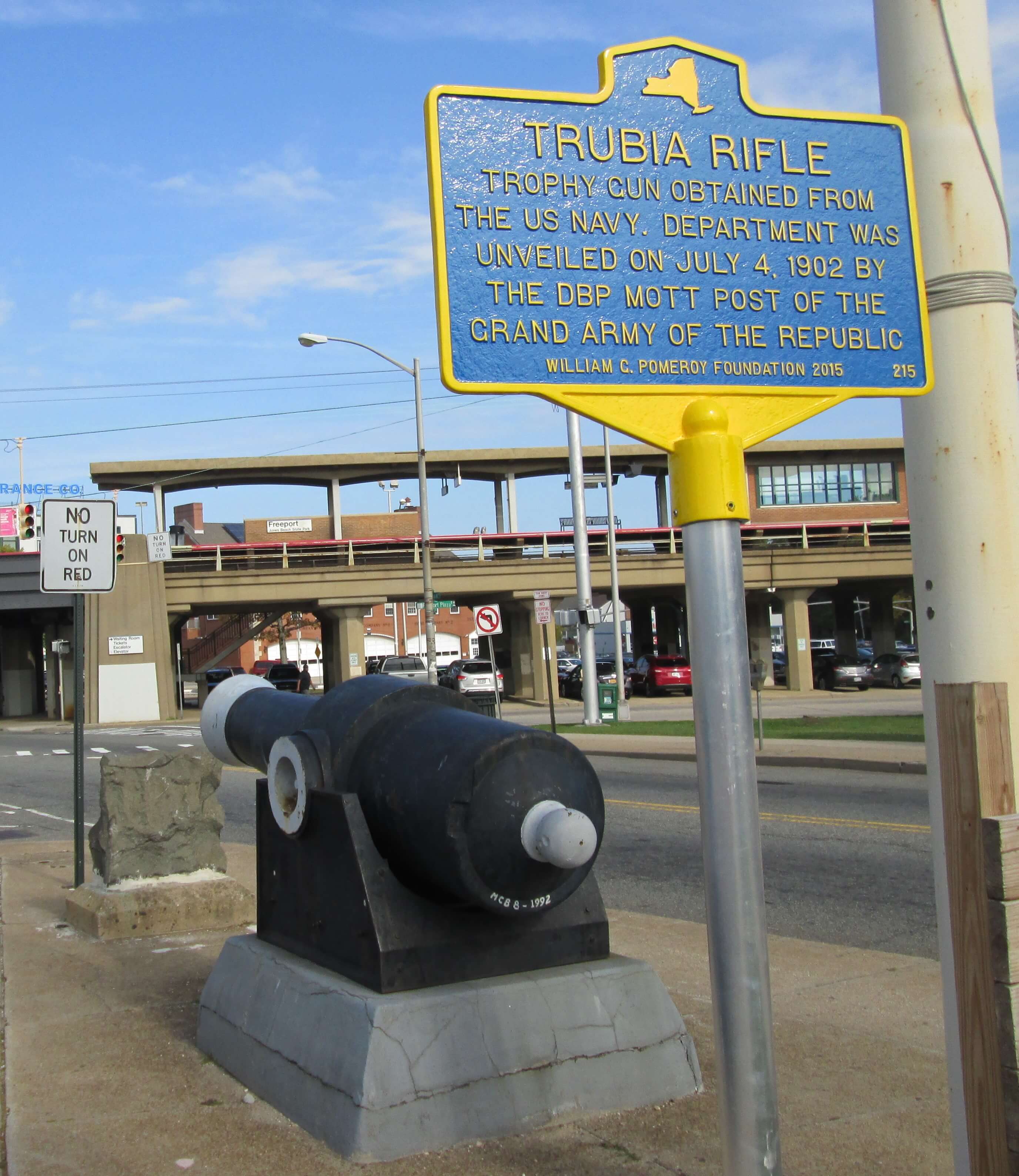 According to an article in the January 17, 1902 Nassau County Review, this Spanish-American War trophy was awarded to the Village of Freeport by the United States Navy. A report to the Village trustees gave the history of this Spanish 8-inch cannon “Trubia” as having been captured at Morro Castle by U.S. Naval Forces at Santiago de Cuba in 1898. Made in Spain, the cannon weighs 12,040 lbs.