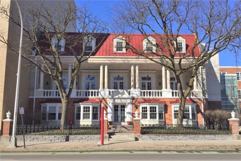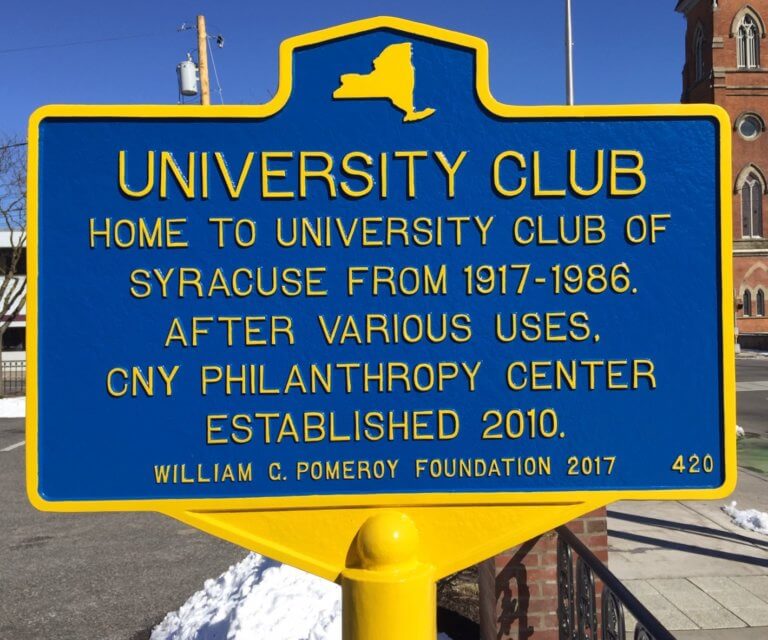 This English Georgian style building served as the home of the University Club from 1917-1986. The University Club was a social club for educated, upper class, men in the city of Syracuse. It featured a billiards room, tap-room, library, and sleeping quarters. The Club closed in 1986 and the building served various uses until 2010 when it became the Central New York Philanthropy Center.