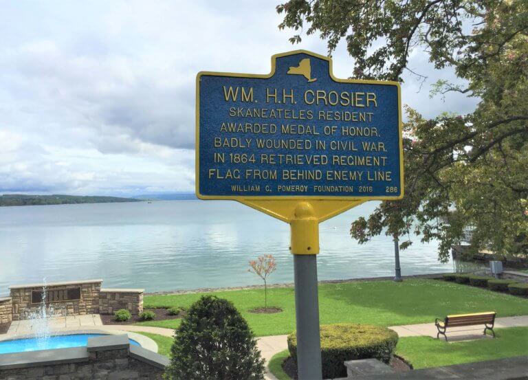 William H.H. Crosier was a resident of Skaneateles who served during the U.S. Civil War. He enlisted in the Union Army on August 20, 1862. He was mustered into service as a Corporal in Company G of the 149th New York Infantry. He was wounded in the battle of Lookout Mountain but returned to military service and was later promoted to Sergeant on January 1, 1864. In an engagement on July 20, 1864 at Peach Tree Creek, Georgia, Sergeant Crosier, was severely wounded and ambushed by Confederate soldiers. With complete disregard for his own life, he went behind enemy lines and retrieved his regiment’s flag. For this heroic action he was later awarded the Congressional Medal of Honor.