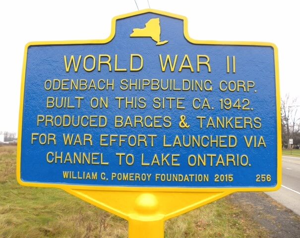 Soon after the attack on Pearl Harbor the United States quickly mobilized for war. As a result, numerous factories sprung up around the country producing uniforms, munitions, planes, ships, tanks, and many other supplies needed to aid the allied forces in the war. At this site in Greece once stood the Odenbach Shipbuilding Corporation, which was built in 1942. This complex produced barges and tankers for the war effort and launched them into a channel into Lake Ontario.